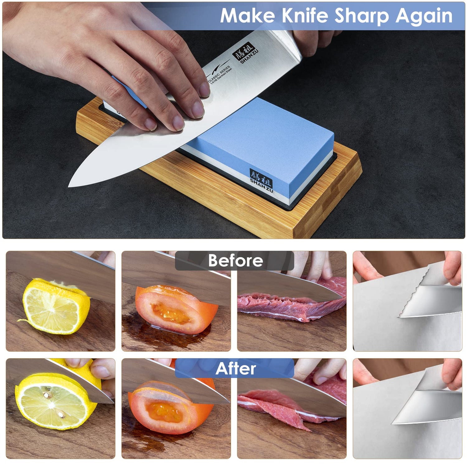 - Use the bamboo base to hold the whetstone and the wear angle guide for the knife and prepare for sharpening.