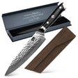 The superb Damascus hammered pattern on the blade, created from 67 layers of steel, is a real showstopper and adds an artistic touch to any kitchen. This rust-resistant pattern also prevents food from sticking to the blade.