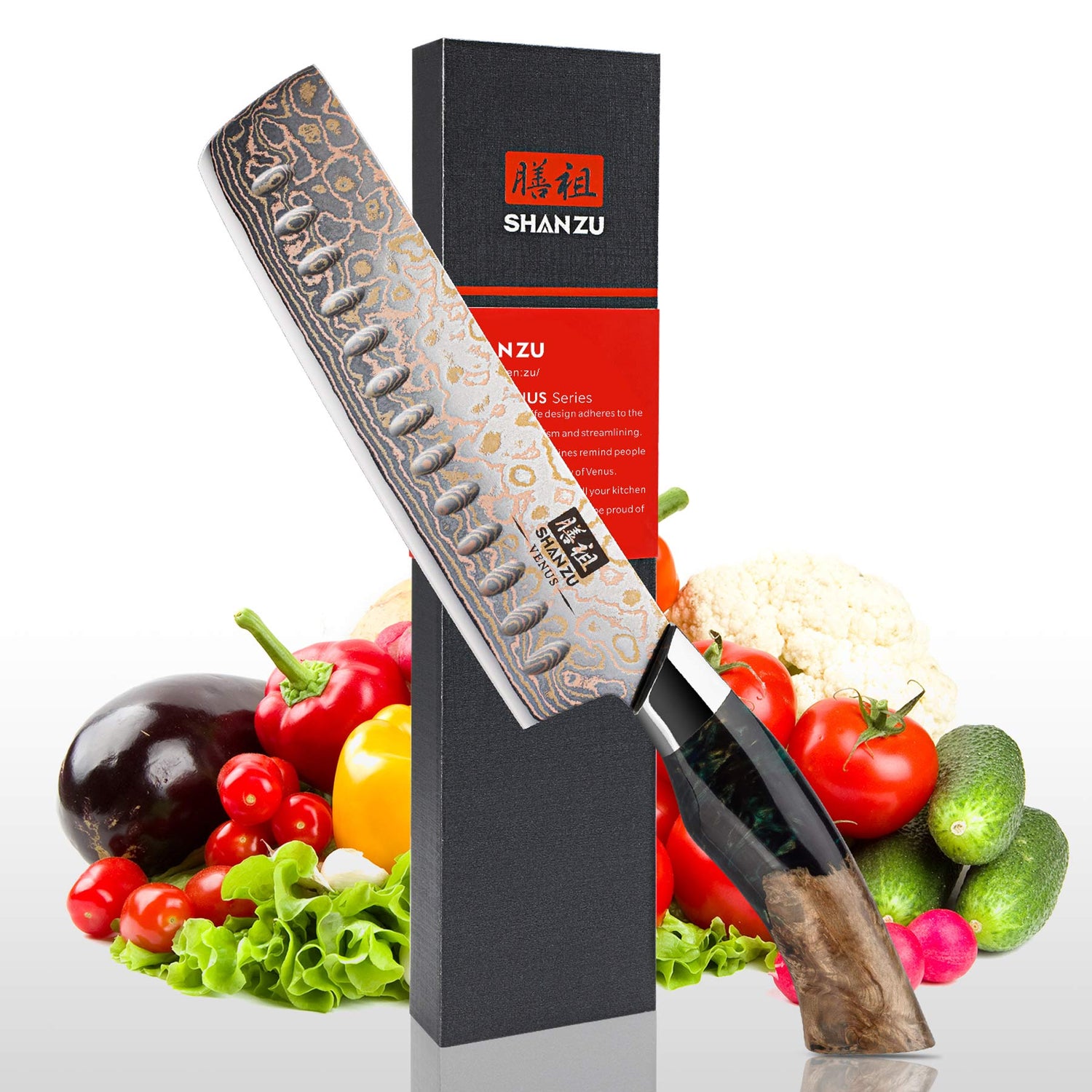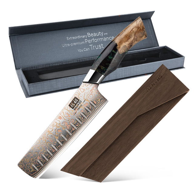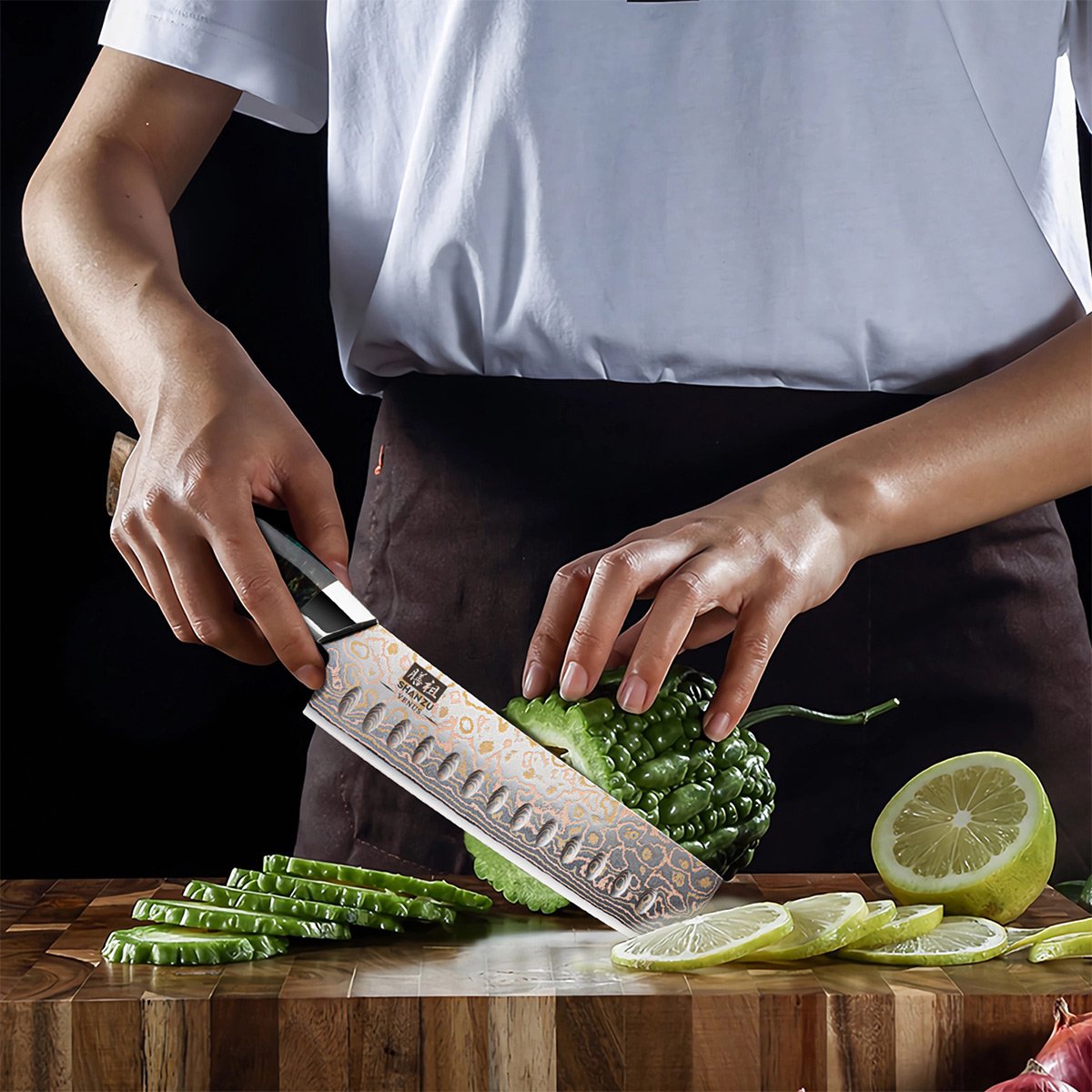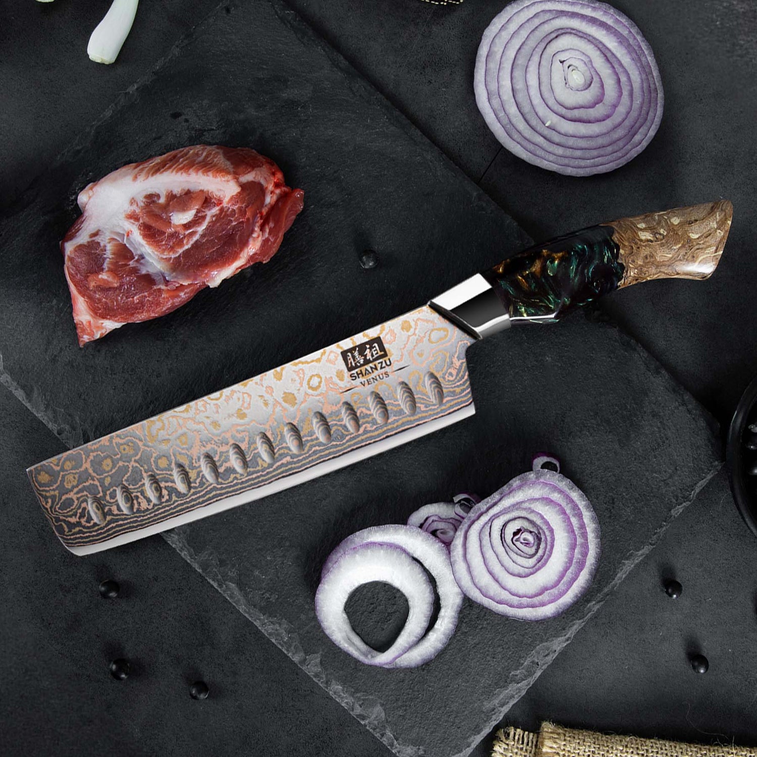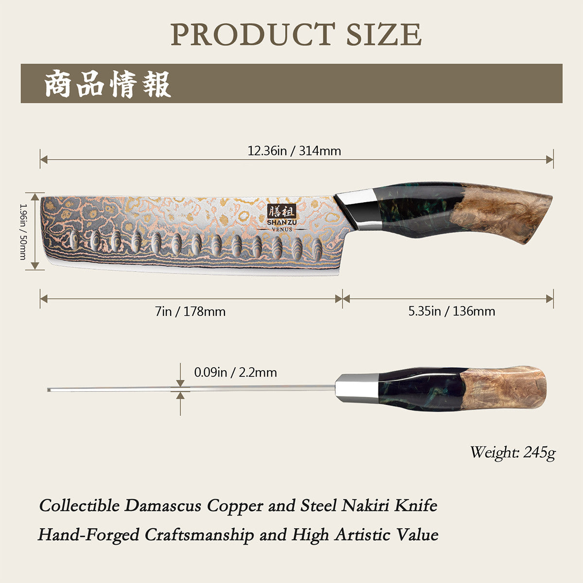 SHAN ZU 7" Blade Copper Damascus Nakiri Knife | Sharpest Kitchen Cooking Knife | 33 Layers Japanese Damascus Steel + G10 Handle – SHANZU GLOBAL SHOP