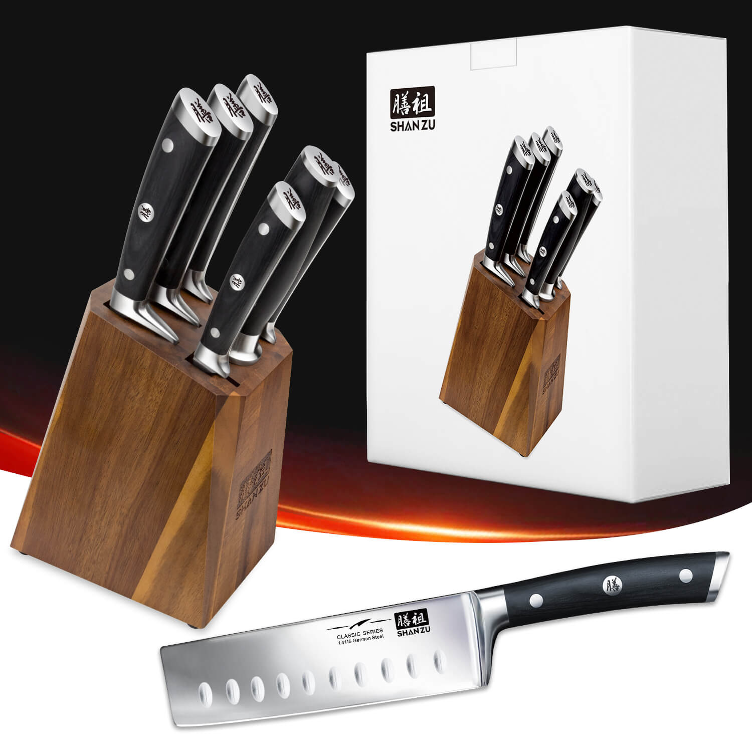 SHAN ZU CLASSIC Series is the first generation of SHAN ZU cutlery, and the line of European-style knives to be made available to a wide audience in the world. Featuring durable German stainless steel with exquisite polish, full bolster serving as a finger guard, ergonomic pakkawood handle with beautiful rivets, the CLASSIC Series offers the graceful control of precise cutting.