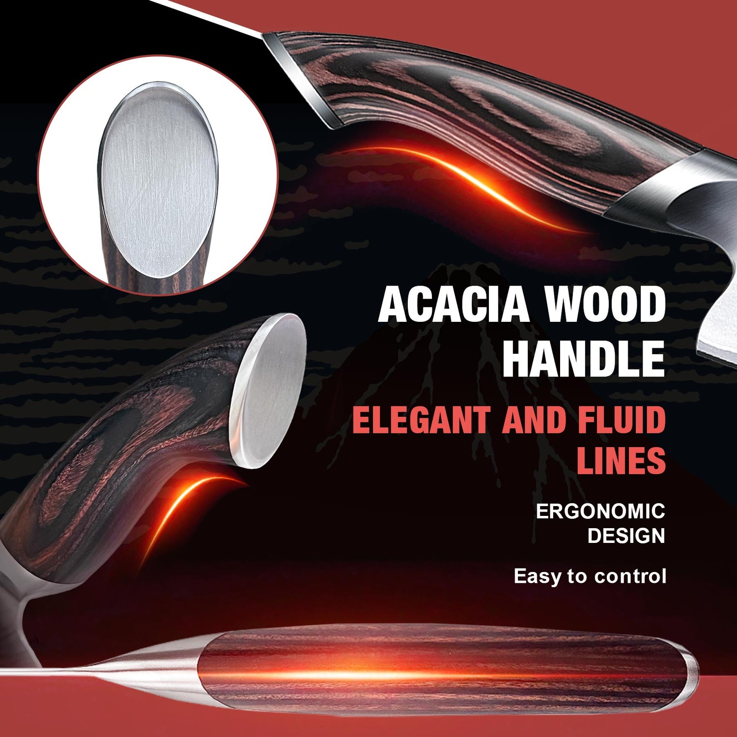 The handle: The handle is crafted from exquisite acacia wood, prized for its strength, durability and beautiful natural grain patterns. The ergonomic design ensures a comfortable grip, offering effortless control and maneuverability for precise cutting, dicing and chopping.